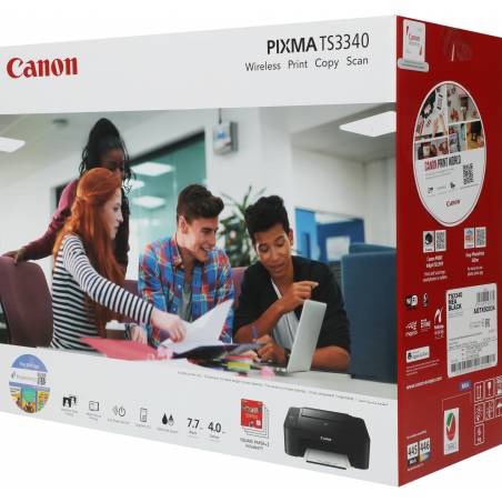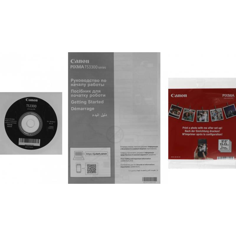 - Принтер «Все в одном» — PIXMA TS3340.Картриджи FINE.Кабель питания.Установочный диск CD-ROM (CD только для ОС Windows).Руководства пользователя и другие документы
