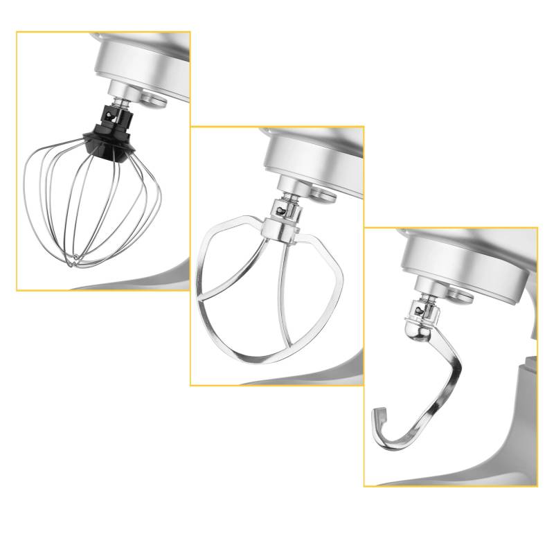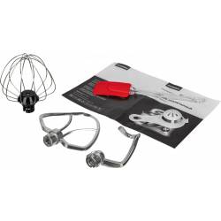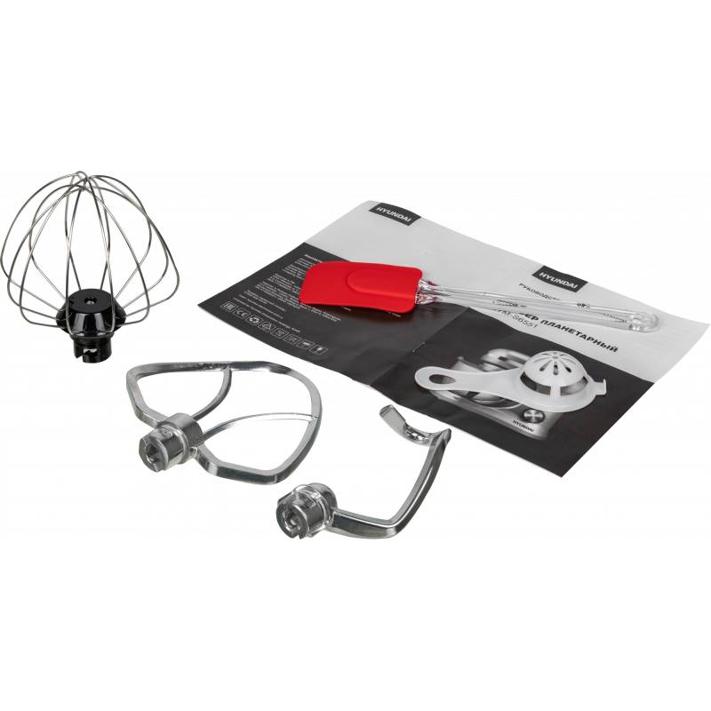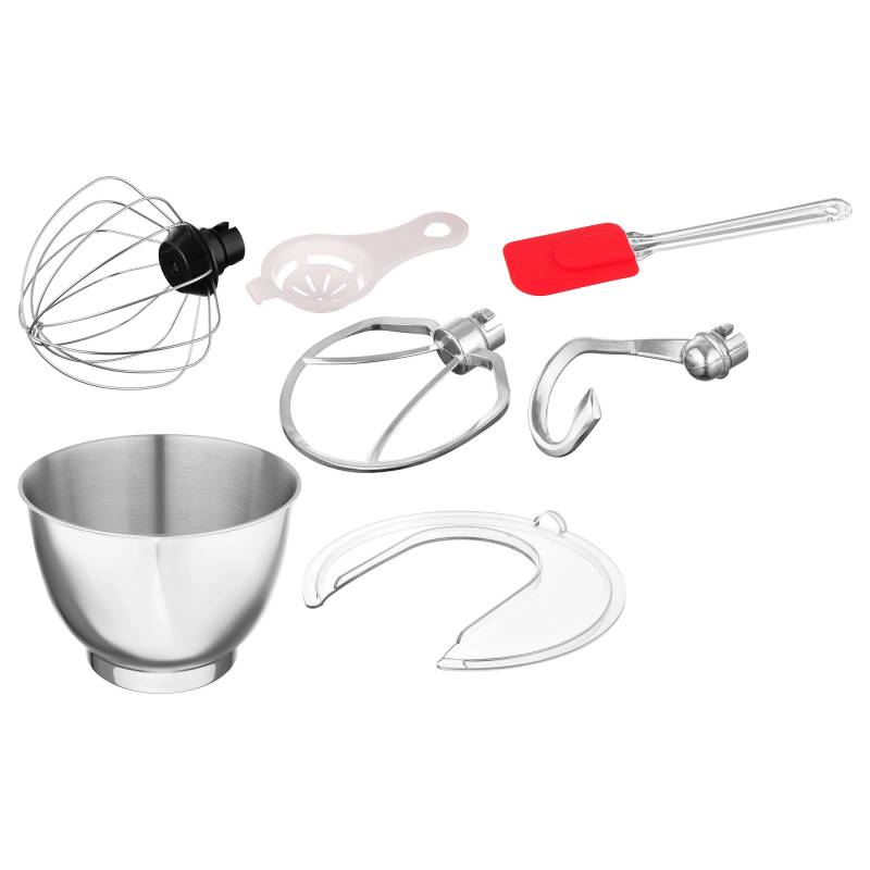 - Планетарный миксер; чаша; защитная крышка; насадка-венчик; насадка-крюк; насадка-лопатка; кулинарная силиконовая лопатка; сепаратор для яиц; руководство пользователя с гаратийным талоном; книга рецептов