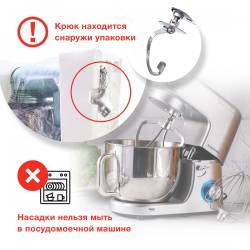 - миксер; чаша; защитная крышка для чаши; насадка-венчик; насадка-крюк; насадка-лопатка; книга рецептов; инструкция с гарантийным талоном