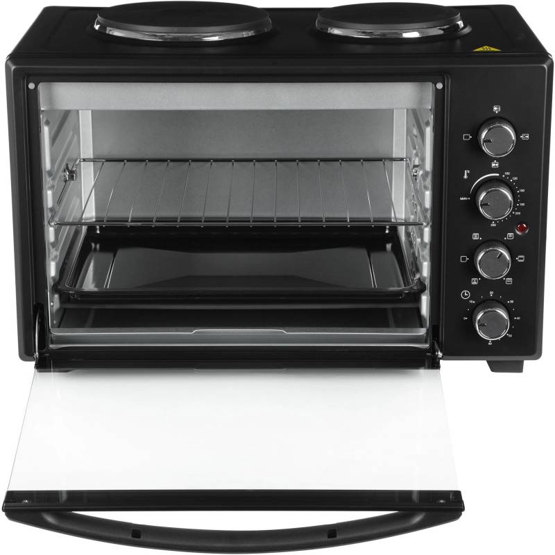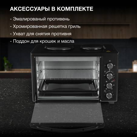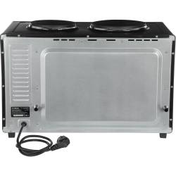 - две конфорки 1000 Вт и 600 Вт, печь две конфорки 1000 Вт и 600 Вт, печь может работать одновременно как мини-печь, используя все функции, так и конфорки. Большая ручка из нержавеющей стали.