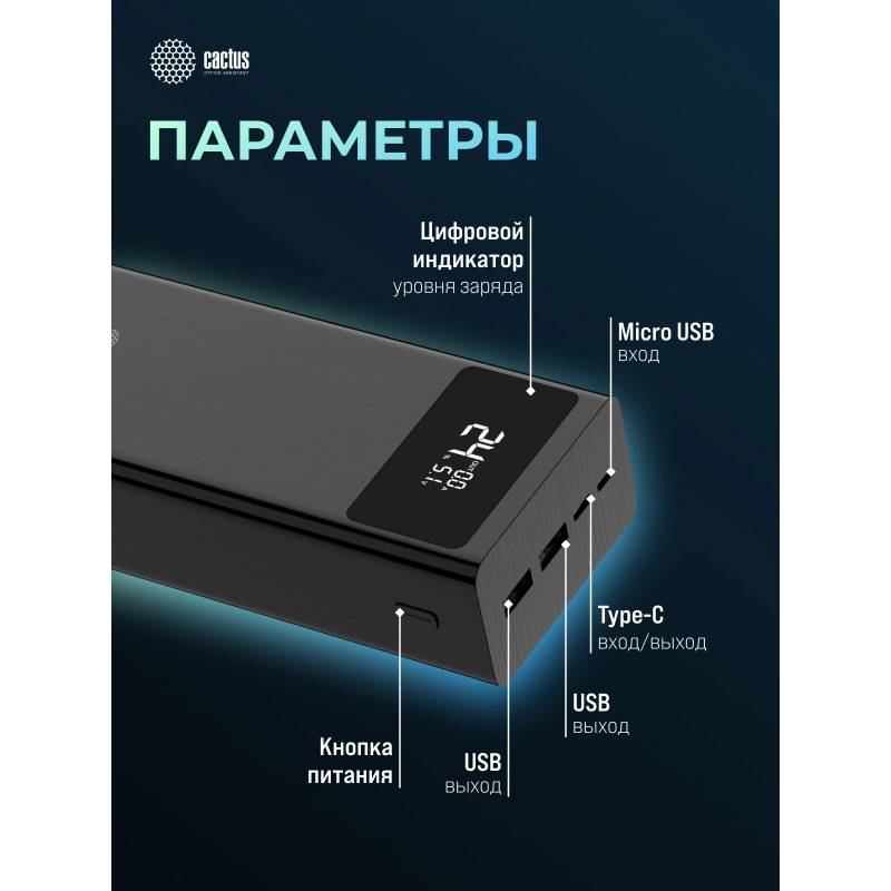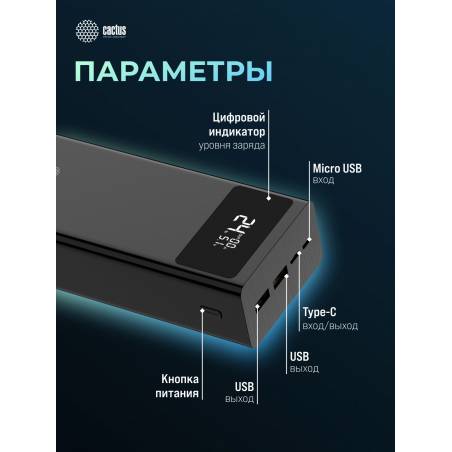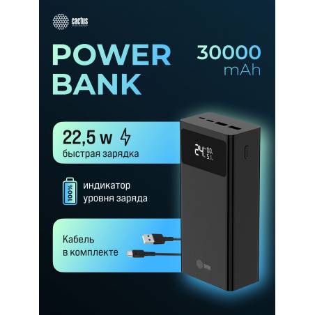 Мобильный аккумулятор Cactus CS-PBFSKA-30000 30000mAh 22.5W 4.5A USB-A/USB-C черный