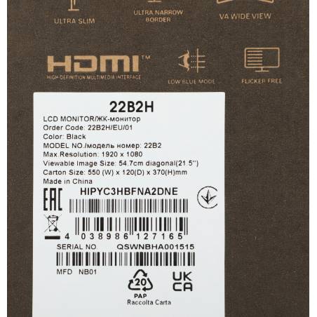 Монитор AOC 21.5" Value Line 22B2H(00/01) черный VA LED 16:9 HDMI матовая 200cd 178гр/178гр 1920x1080 75Hz VGA FHD 2.1кг