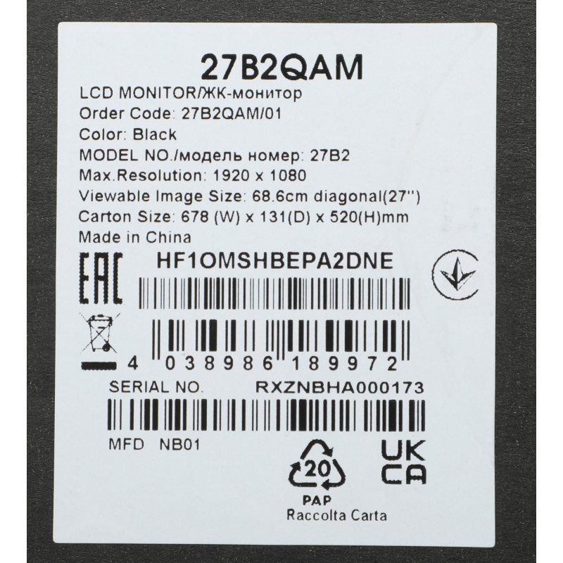 Монитор AOC 27" Value Line 27B2QAM черный VA LED 16:9 HDMI M/M матовая 250cd 178гр/178гр 1920x1080 75Hz VGA DP FHD 3.7кг
