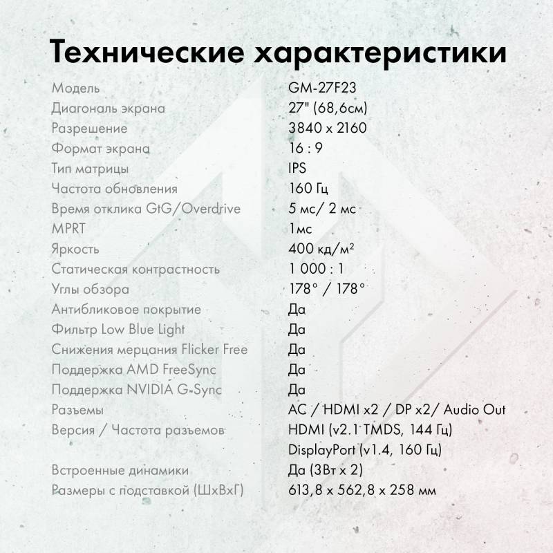 Монитор GMNG 27" Gaming GM-27F23 черный IPS LED 2ms 16:9 HDMI M/M матовая HAS Piv 400cd 178гр/178гр 3840x2160 160Hz G-Sync FreeS
