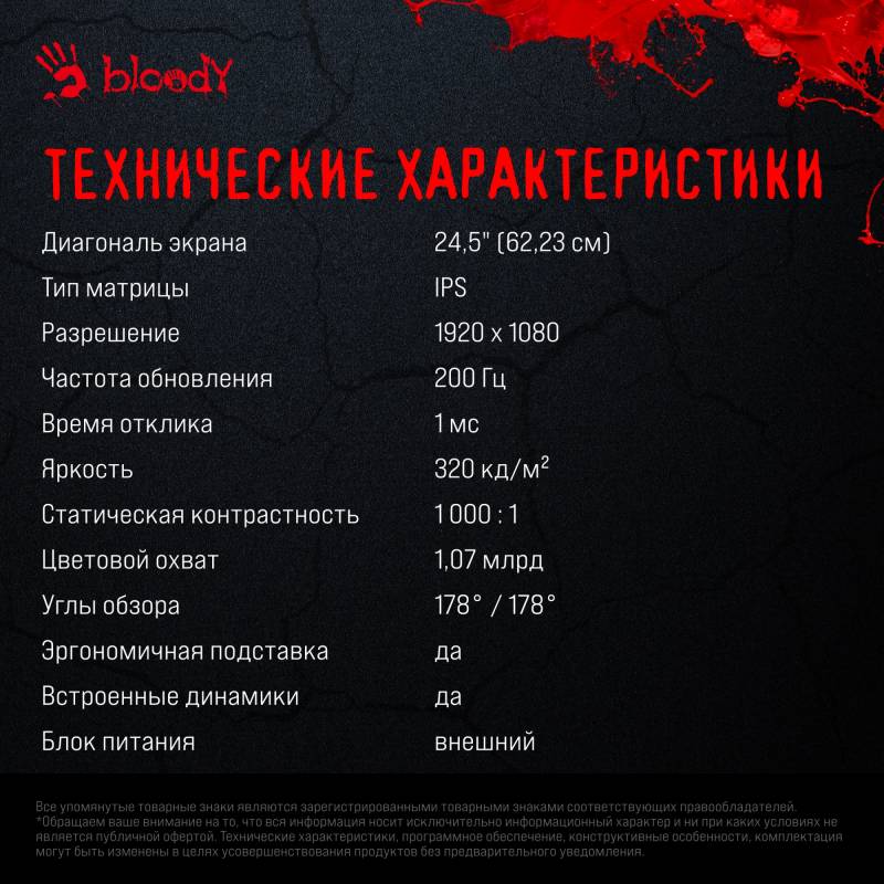 Монитор Bloody 24.5" MN251F серый IPS LED 1ms 16:9 HDMI M/M матовая HAS Piv 320cd 178гр/178гр 1920x1080 200Hz G-Sync DP FHD USB