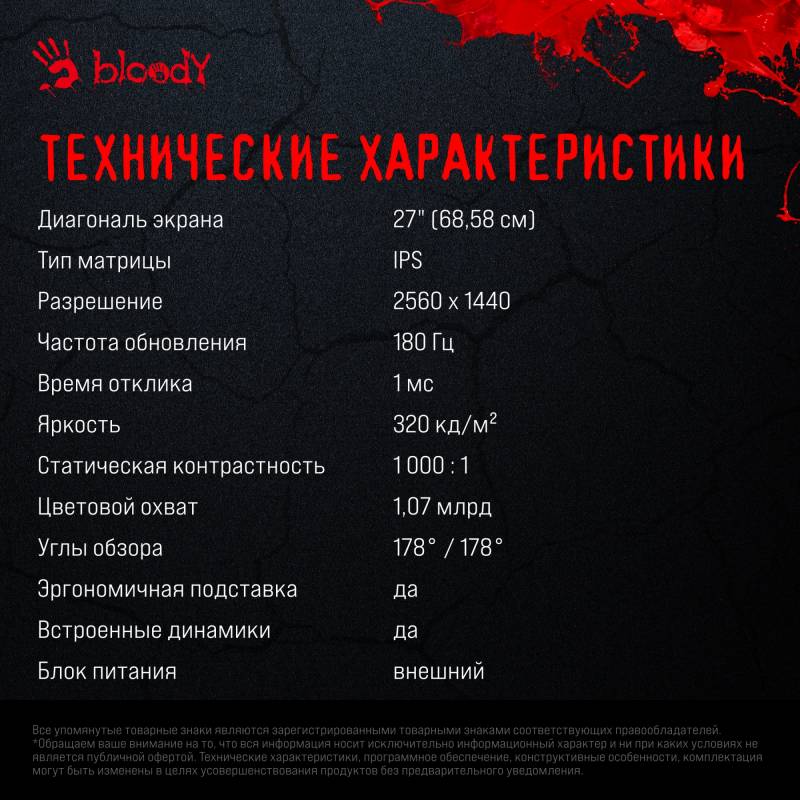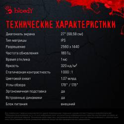 Монитор Bloody 27" MN271Q серый IPS LED 1ms 16:9 HDMI M/M матовая HAS Piv 320cd 178гр/178гр 2560x1440 180Hz G-Sync DP 2K USB 5.1
