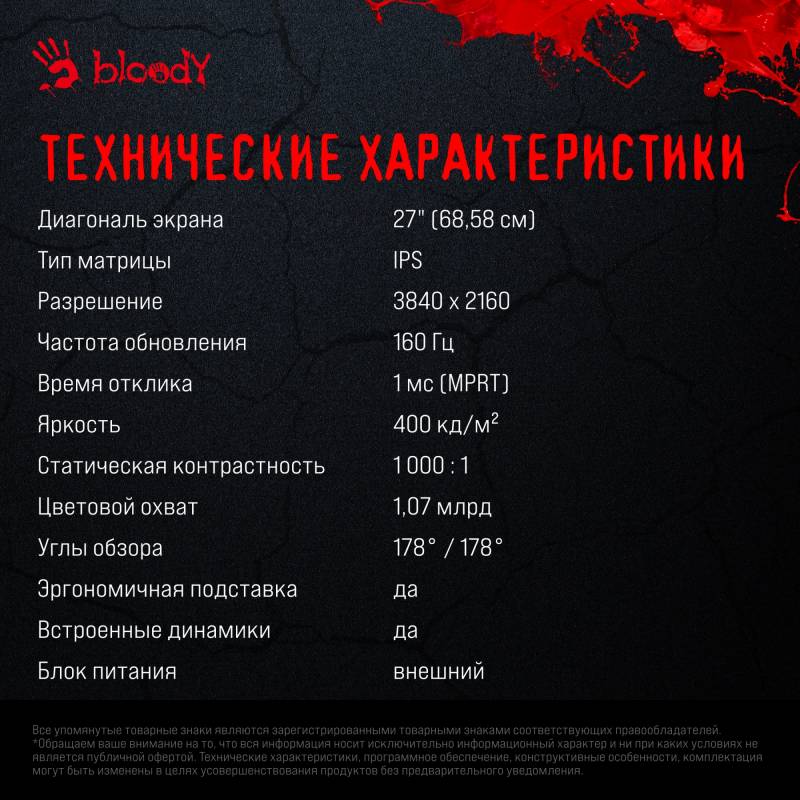 Монитор Bloody 27" MN272U черный IPS LED 1ms 16:9 HDMI M/M матовая HAS 400cd 178гр/178гр 3840x2160 160Hz G-Sync FreeSync DP 4K 6