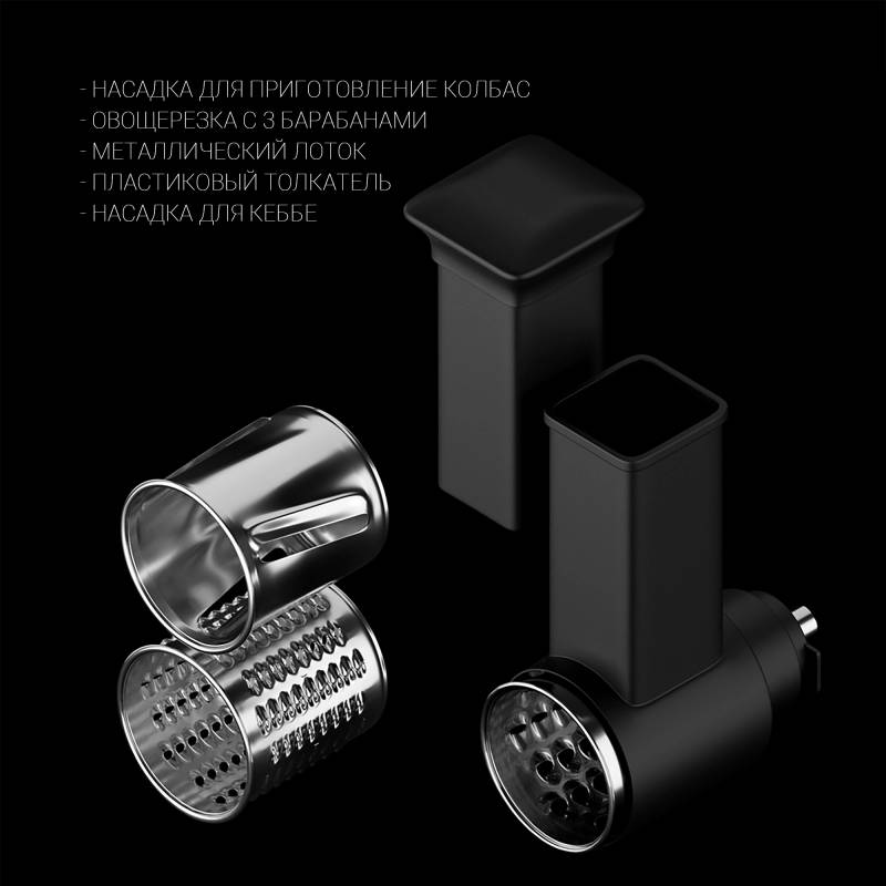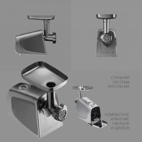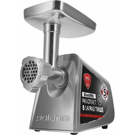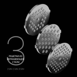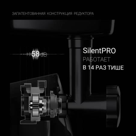 - ЗАПАТЕНТОВАННАЯ КОНСТРУКЦИЯ РЕДУКТОРА SilentPRO: РАБОТАЕТ В 14 РАЗ ТИШЕ. Интеллектуальная система - Autorevers (автоматический запуск функции реверса). В комплекте: 3 решетки из нержавеющей стали (3 мм, 5 мм, 8 мм), овощерезка с 3 барабанами, наса