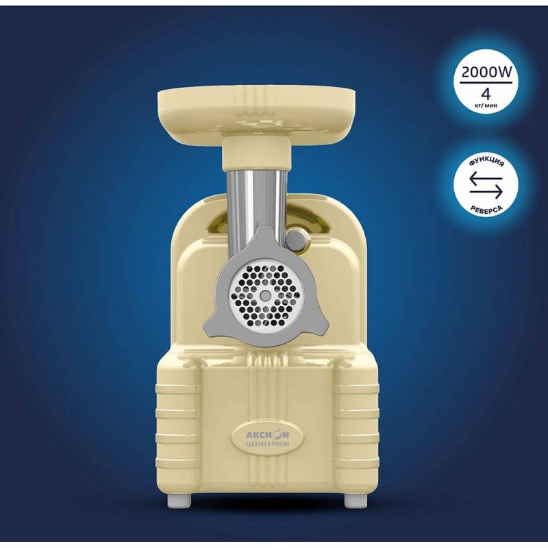 - Электрическая мясорубка М63 «Аксион» совместила в себе эпоху прошлого с ее плавными формами и теплыми тонами, при этом сохранив в себе современные технические характеристики. Мощная мясорубка приготовит до 4 кг фарша в минуту и позволит побаловать семью