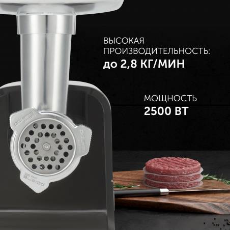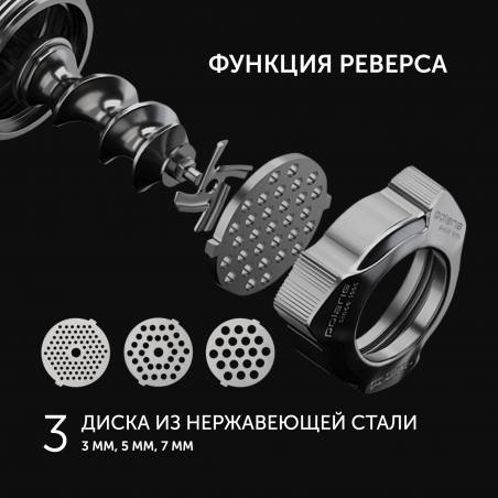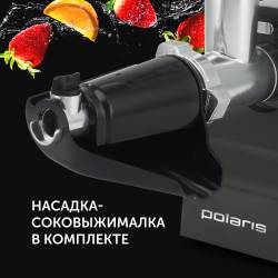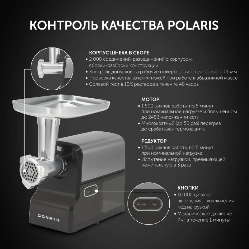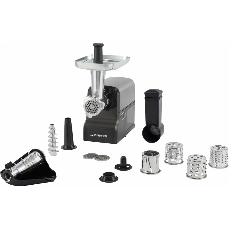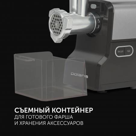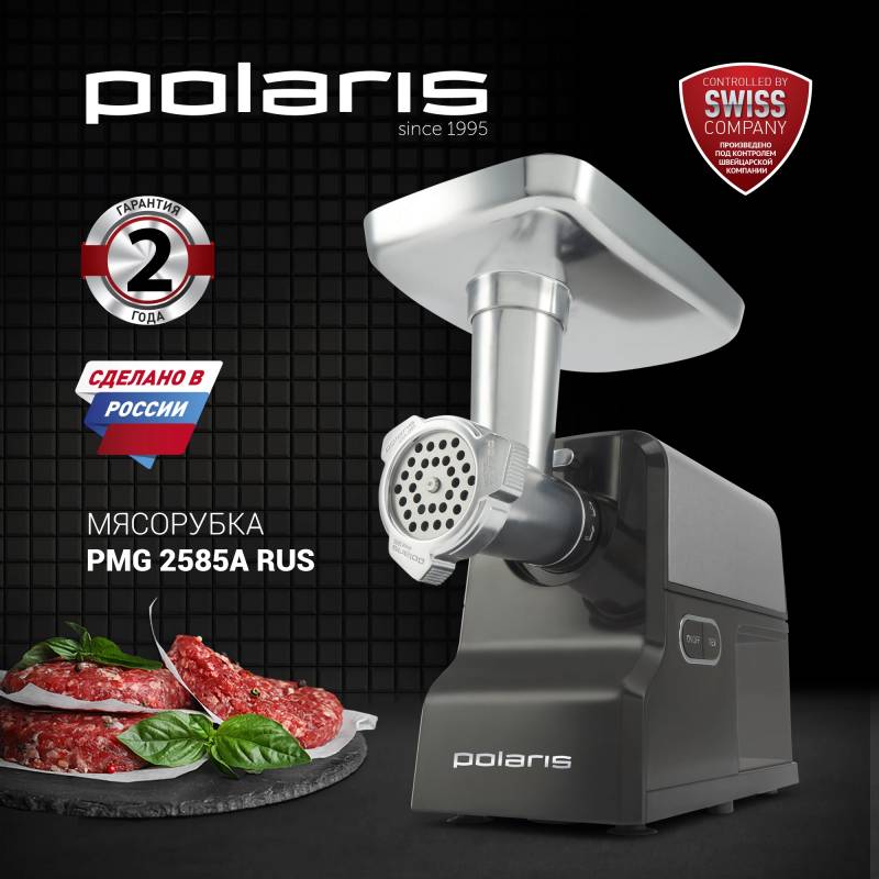 - Многофункциональная мясорубка Polaris PMG 2585 RUS оснащена надежным мотором мощностью 2500 Вт, что обеспечивает высокую производительность прибора: до 2,8 кг мяса в минуту. Конструкция предусматривает съемный лоток для фарша и хранения аксессуаров.