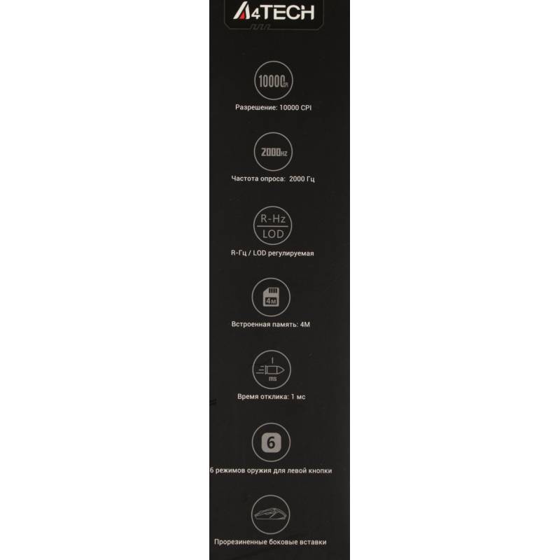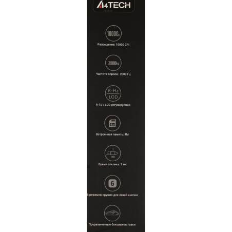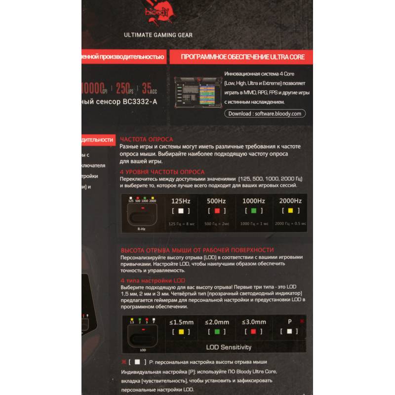 - 5 эффектов подсветкиПрорезиненный скроллМеталлические ножки X' Glide4 типа настройки высоты отрыва LOD. при установке ПО Bloody7, уровни core3,4 активированы бесплатно