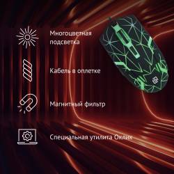 - Удобная полноразмерная мышь подходящая как для игры так и для работы с офисными приложениями. 6 кнопок, возможность выбора оптимального разрешения, покрытие soft-touch, многоцветная, подсветка, кабель в оплетке с ферритовым фильтром. Специальное ПО на сай