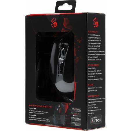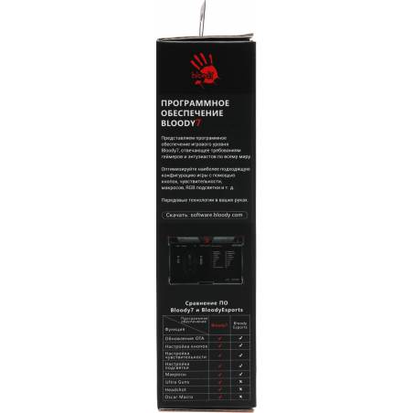 - 15-ти зонная RGB подсветка5 эффектов подсветкиДополнительная кнопка FireРегулировка по осям X / Y6 режимов стрельбы для левой кнопкиПрорезиненные боковые вставкиМеталлические ножки X' Glide. при установке ПО Bloody7, уровни core3,4 активированы бесплатно