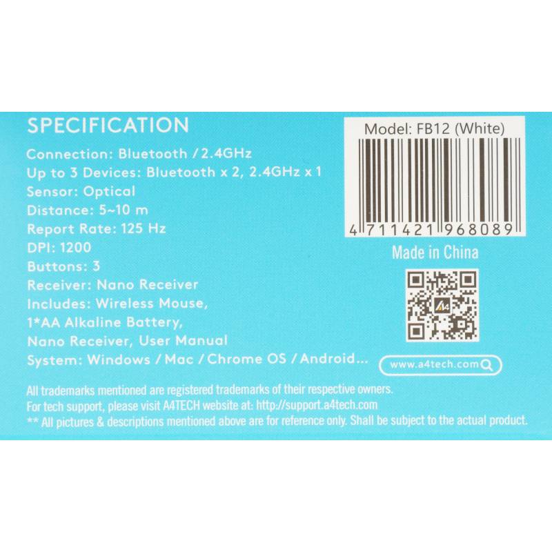 Мышь A4Tech Fstyler FB12 белый оптическая 1200dpi беспров. BT/Radio USB 3but (FB12 WHITE)