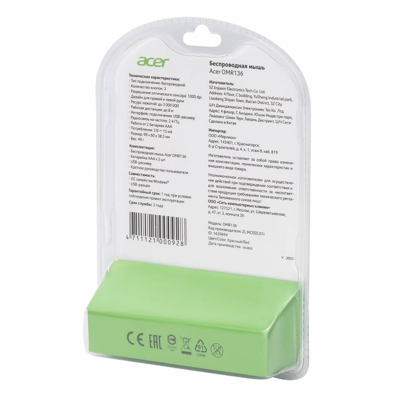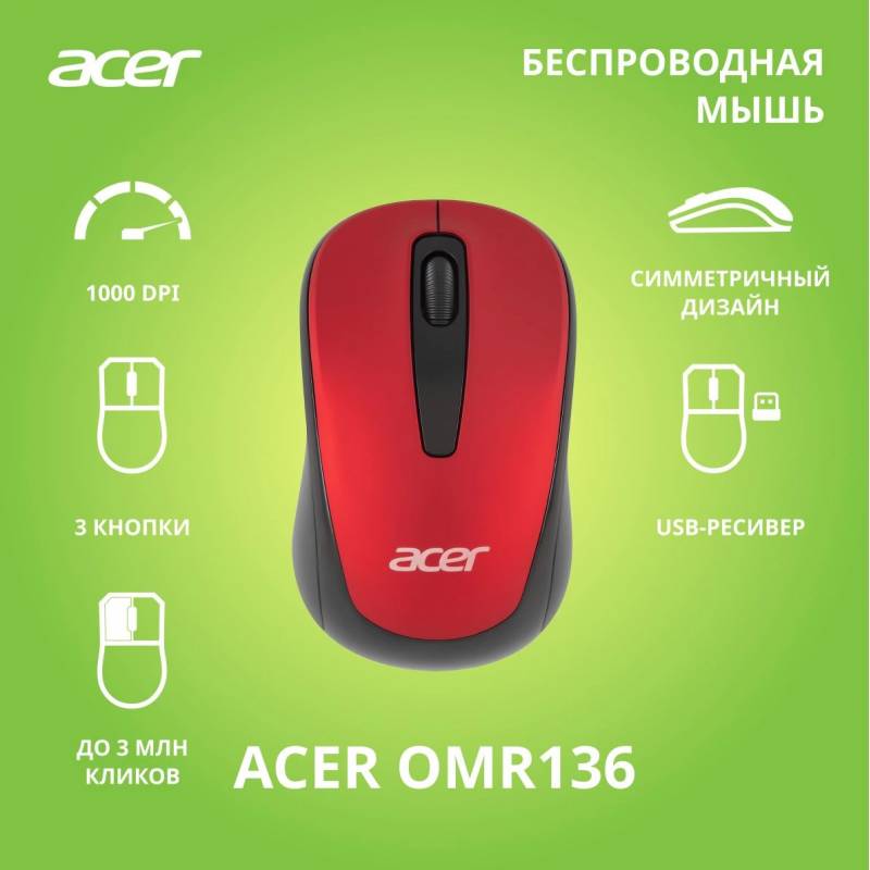 Мышь Acer OMR136 красный оптическая 1000dpi беспров. USB для ноутбука 3but (ZL.MCEEE.01J)