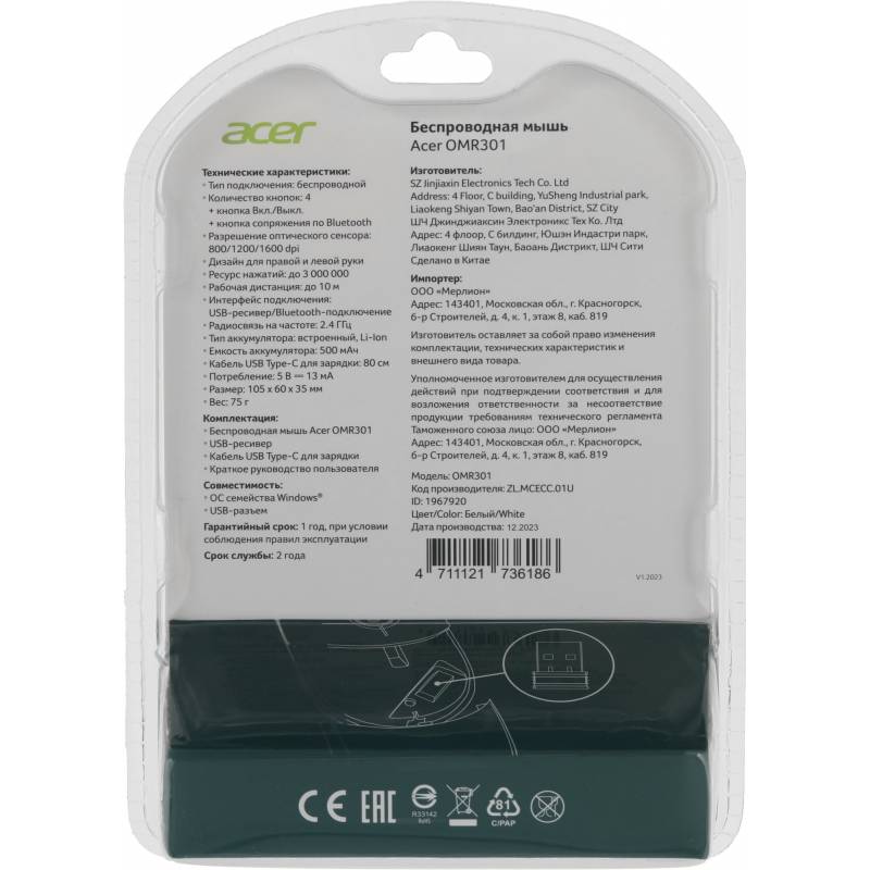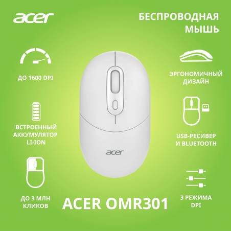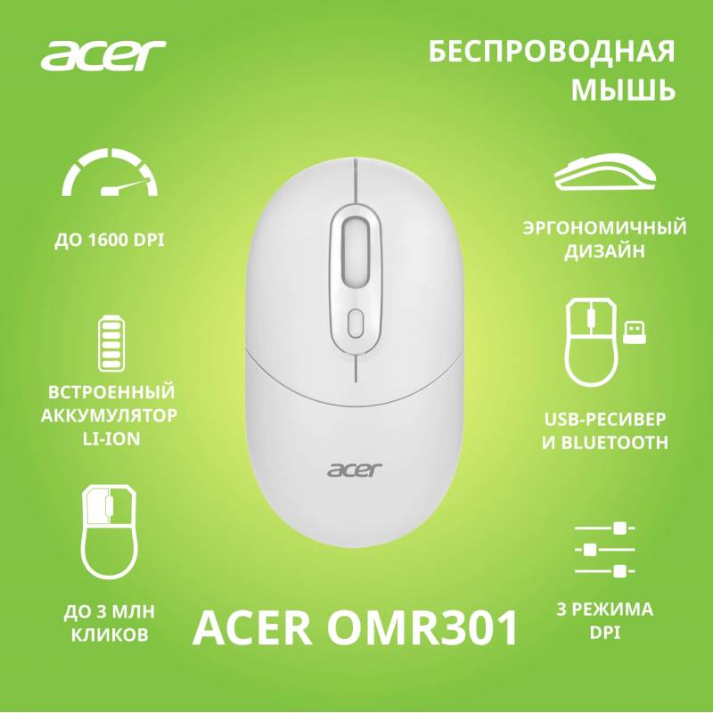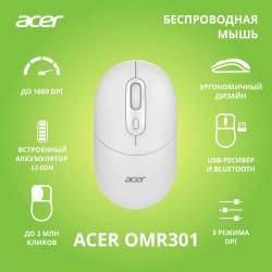 Мышь Acer OMR301 белый оптическая 1600dpi беспров. BT/Radio USB 4but (ZL.MCECC.01U)