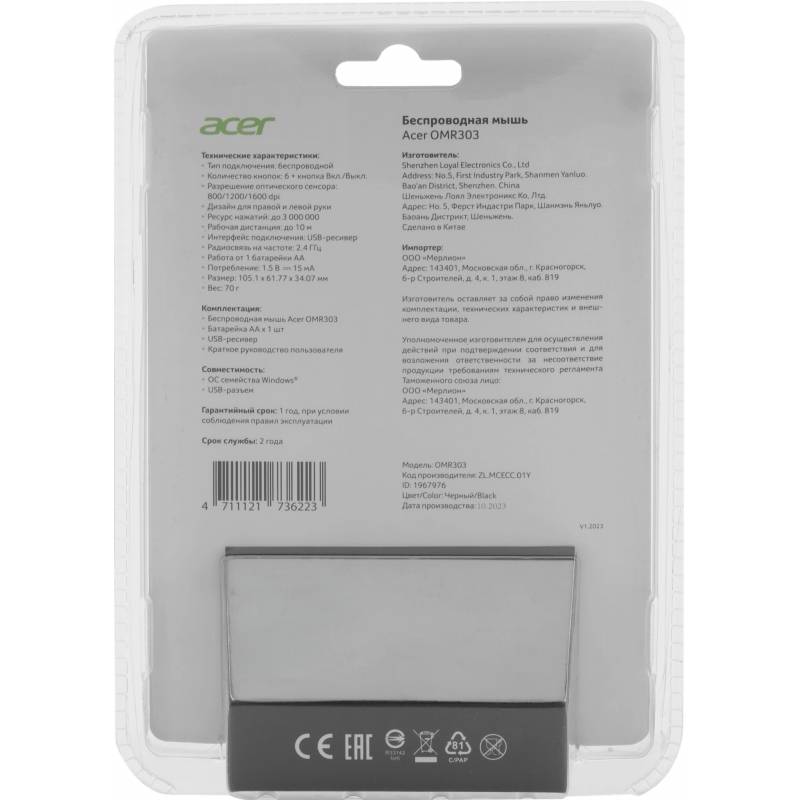 Мышь Acer OMR303 черный оптическая 1600dpi беспров. USB 6but (ZL.MCECC.01Y)