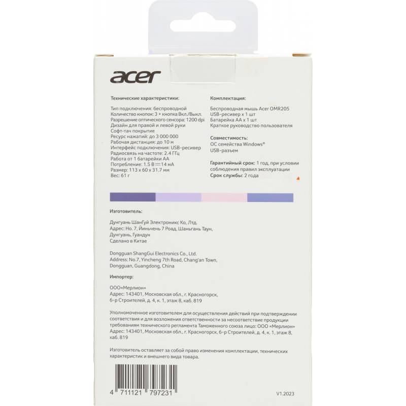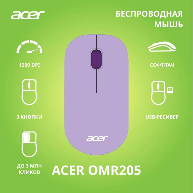 Мышь Acer OMR205 фиолетовый оптическая 1200dpi беспров. USB для ноутбука 3but (ZL.MCEEE.02K)
