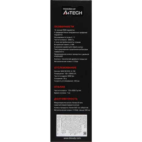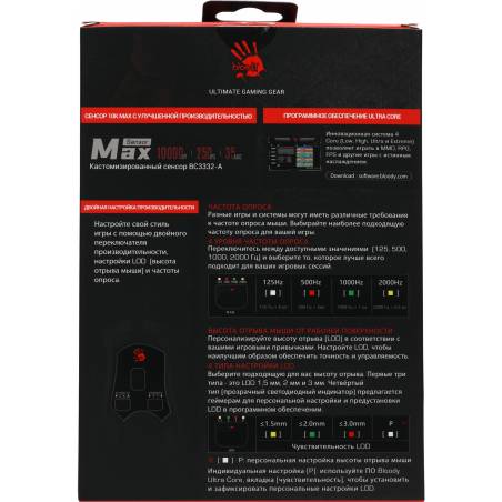 - Кастомизированный сенсор MAX BC3332-A 10K, 8000 FPS, 250 IPS, регулируемая высота отрыва, 5 профилей RGB подстветки, время отклика: 1 мс, металлические ножки. при установке ПО Bloody7, уровни core3,4 активированы бесплатно