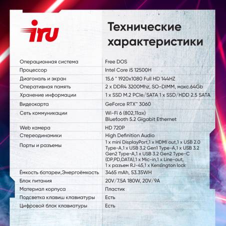 Ноутбук IRU Калибр 15ALC Core i5 12500H 16Gb SSD512Gb NVIDIA GeForce RTX 3060 6Gb 15.6" IPS FHD (1920x1080) без ОС black WiFi BT