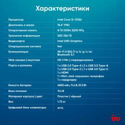 Ноутбук IRU Tactio 15ALG Core i3 1215U 8Gb SSD256Gb Intel UHD Graphics 15.6" IPS FHD (1920x1080) без ОС black WiFi BT Cam 4500mA