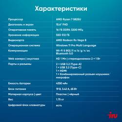 Ноутбук IRU Tactio 15PHC Ryzen 7 5825U 16Gb SSD512Gb AMD Radeon Graphics 15.6" IPS FHD (1920x1080) Windows 11 Pro Multi Language