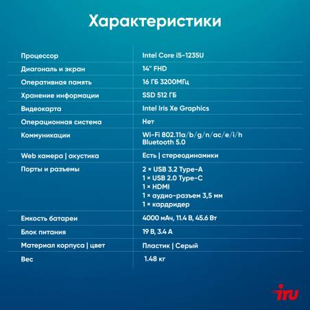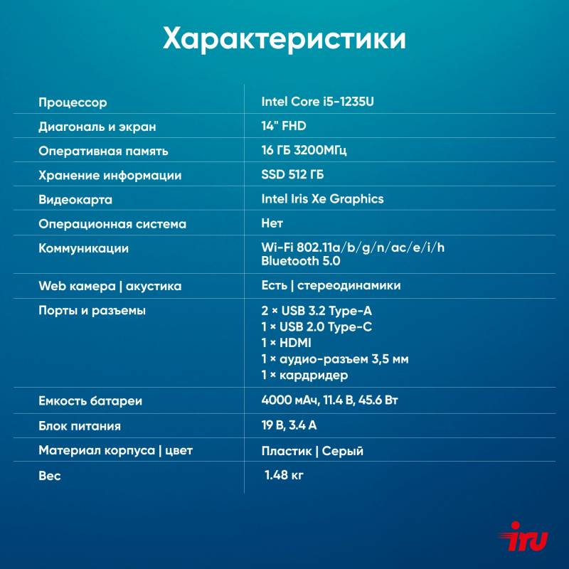 Ноутбук IRU Tactio 14ALH Core i5 1235U 16Gb SSD512Gb Intel Iris Xe graphics 14" IPS FHD (1920x1080) FreeDOS grey WiFi BT Cam 400