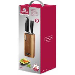 - Материал клинка: высококачественная нержавеющая сталь X30Cr13. Материал рукотяки: ABS пластик. Стальные вставки на рукоятке помогают с лёгкостью определить тип стали. Анатомическая форма рукоятки. Блок из дерева акации, отличающегося высокой плотн