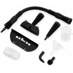 - струйная насадка, угловая насадка, круглая нейлоновая щетка, паровой шланг, насадка для отпаривания, тряпка для отпаривания, насадка с резиновым скребком