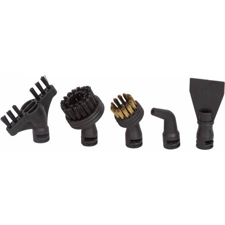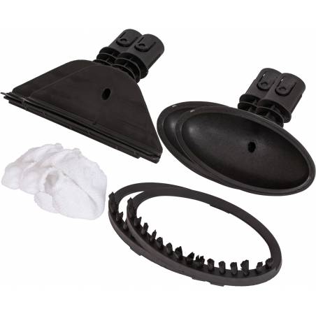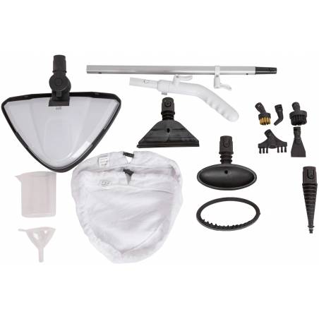 - Швабра, мерный стакан, воронка, насадка для очистки ковров, насадка для очистки пола, конусная насадка, металлическая щетка, нейлоновая щетка, насадка скребок, изогнутая насадка, для очистки межплиточных швов, насадка для отпаривания, микрофибра, дополнит