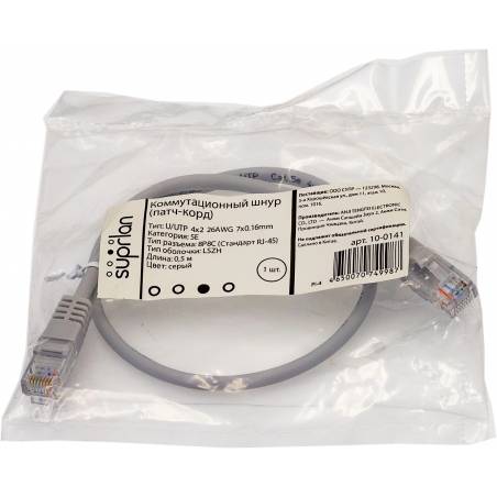 Патч-корд Suprlan 10-0141 UTP RJ-45 вил.-вилка RJ-45 кат.5E 0.5м серый LSZH 26AWG