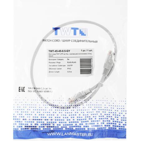 Патч-корд Lanmaster TWT-45-45-0.5-GY UTP RJ-45 вил.-вилка RJ-45 кат.5E 0.5м серый ПВХ (уп.:1шт)