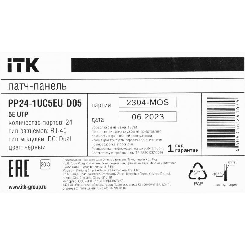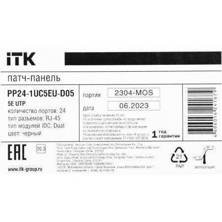 Патч-панель ITK PP24-1UC5EU-D05 19" 1U 24xRJ45 кат.5E UTP
