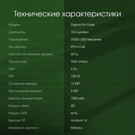 Планшет Digma Pro Pulse T606 (1.6) 8C RAM6Gb ROM128Gb 10.4" In-Cell 2000x1200 4G 2Sim Android 14 темно-зеленый 13Mpix 5Mpix BT W