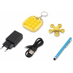 - Сетевой адаптер питания; USB-C кабель; набор наклеек; стилус; спиннер; поп-ит игрушка