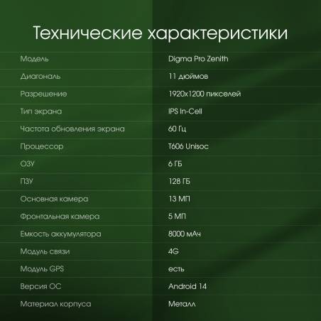 Планшет Digma Pro Zenith T606 (1.6) 8C RAM6Gb ROM128Gb 11" IPS 1920x1200 4G 2Sim Android 14 графит 13Mpix 5Mpix BT WiFi microSD