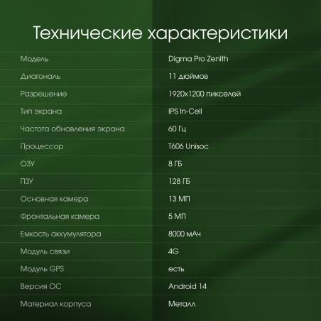 Планшет Digma Pro Zenith T606 (1.6) 8C RAM8Gb ROM128Gb 11" IPS 1920x1200 4G 2Sim Android 14 графит 13Mpix 5Mpix BT WiFi microSD