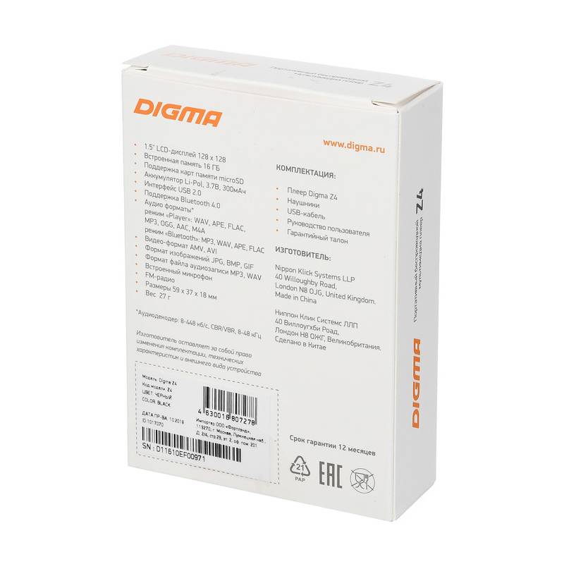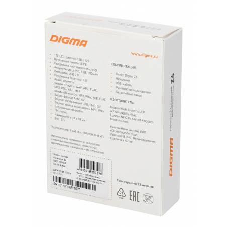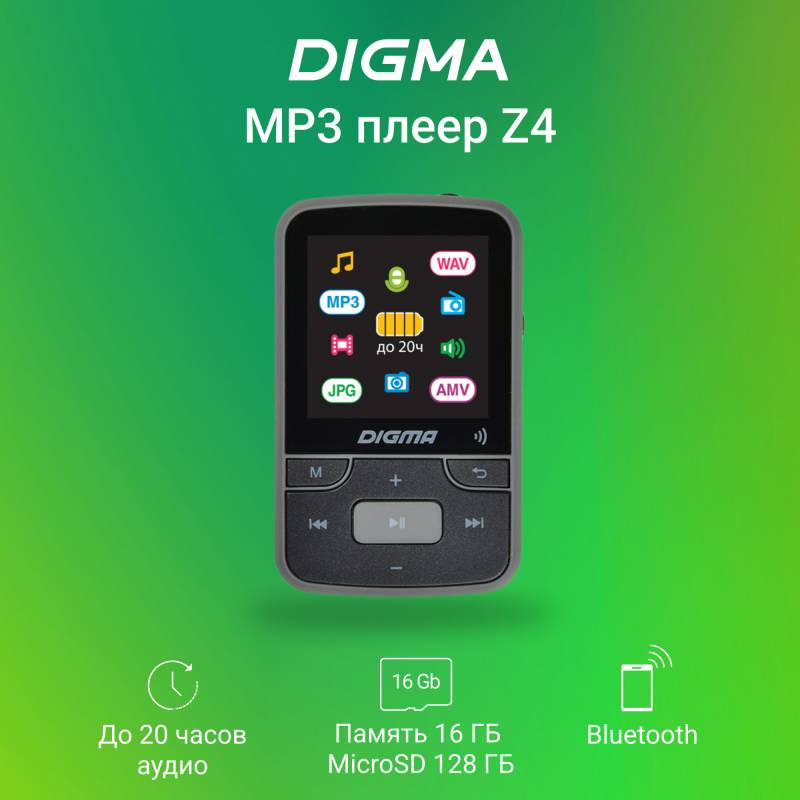 Плеер Hi-Fi Flash Digma Z4 BT 16Gb черный/1.5"/FM/microSDHC/clip