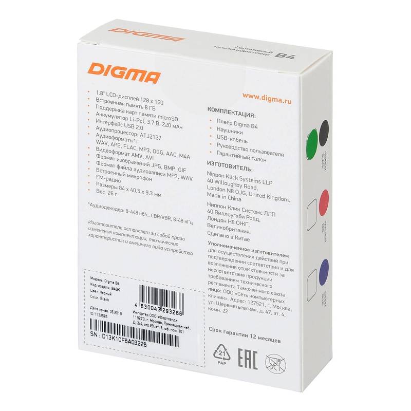 Плеер Hi-Fi Flash Digma B4 8Gb черный/1.8"/FM/microSDHC