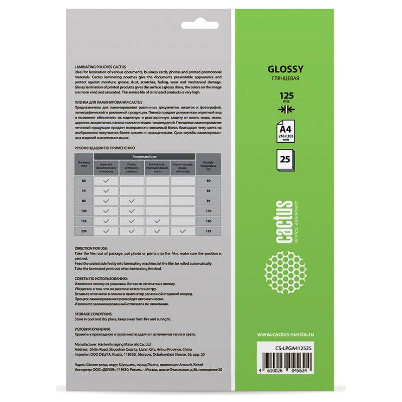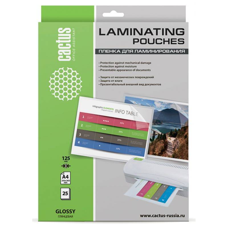 Пленка для ламинирования Cactus 125мкм A4 (25шт) глянцевая 216x303мм CS-LPGA412525