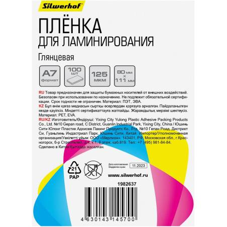 Пленка для ламинирования Silwerhof 125мкм A7 (100шт) глянцевая 80x111мм