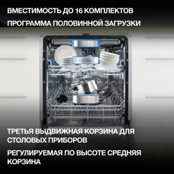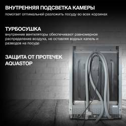 - Таймер на полу;Дополнительные функции: Экстра быстро, Дополнительная сушка, Экстра гигиена, Ночной режим, Хранение до 168 часов, Очистка камеры