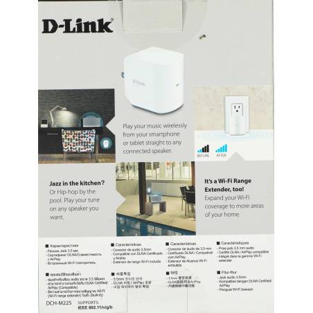 - DCH-M225 - это портативный повторитель, позволяющий увеличить зону покрытия существующей беспроводной сети. Он также способен передавать в потоковом режиме музыку в любую точку в пределах зоны покрытия расширенной беспроводной сети.