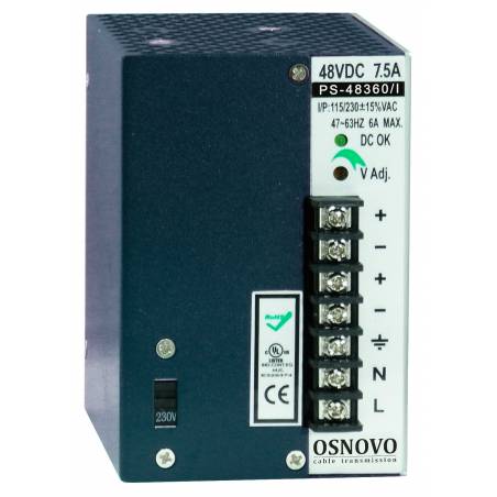 - Промышленный блок питания. DC48V, 7,5A (360W). Диапазон входных напряжений: AC195-265V. КПД: 83%. Регулировка выходного напряжения в диапазоне 44-53V. Защита от короткого замыкания, перенапряжения и перегрузки. Принудительная система охлаждения (в
