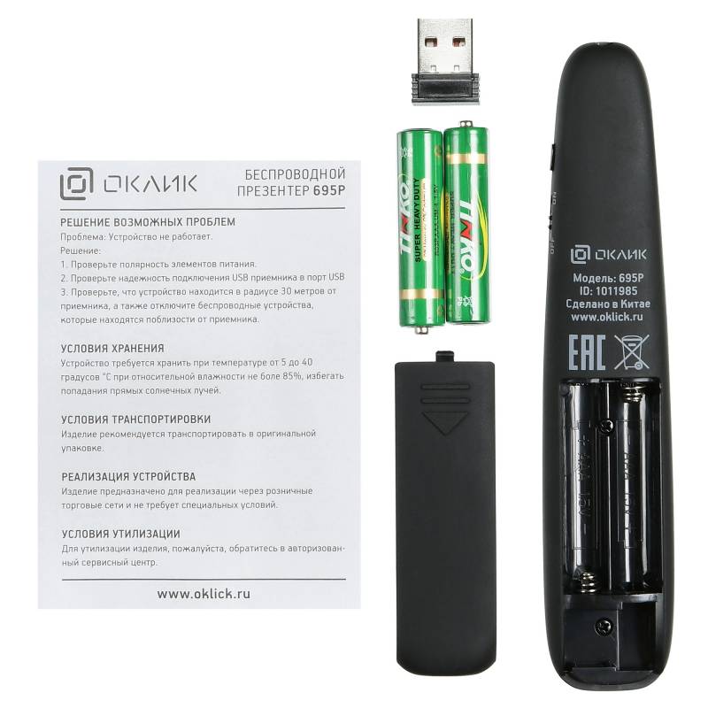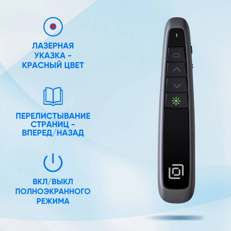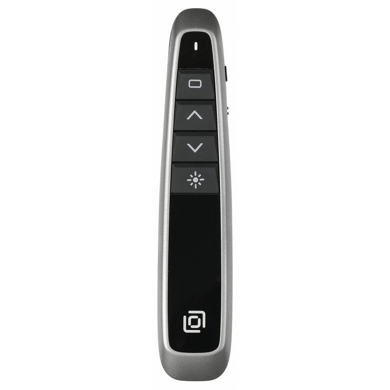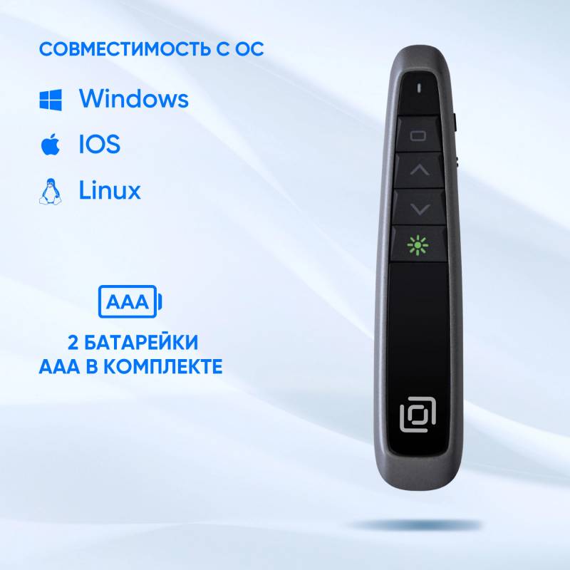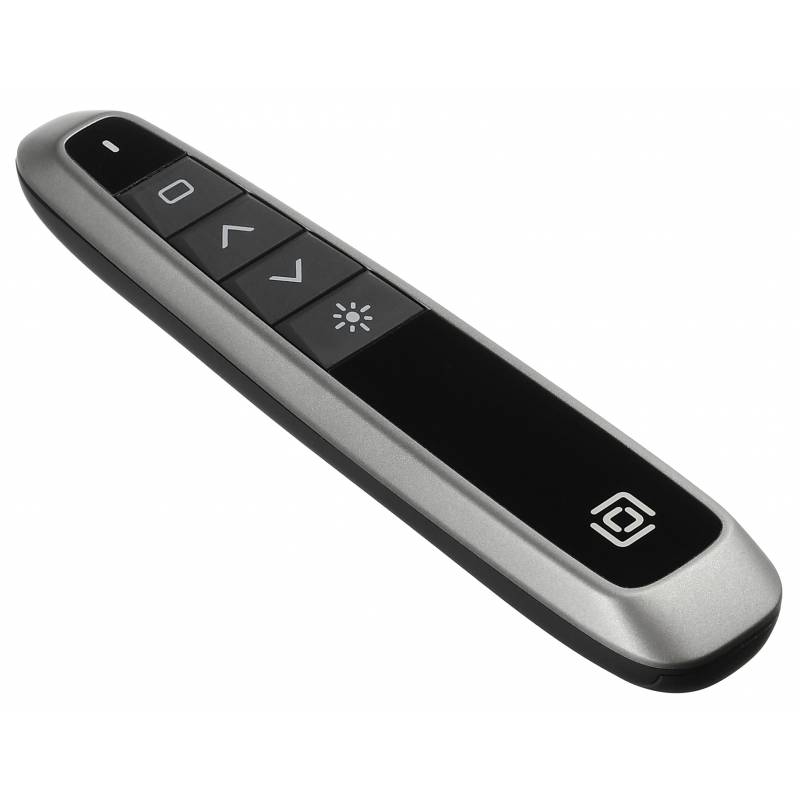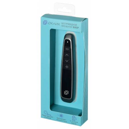 - Предназначен для управления показаом слайдов. Радиосвязщсь на частоте 2,4 ГГц. Частота волны лазера 650 нм. Имеется компактны USB-ресивер, убирющийся в корпус. СОвместимость с ОС Windows и MAC. Свободный USB порт.