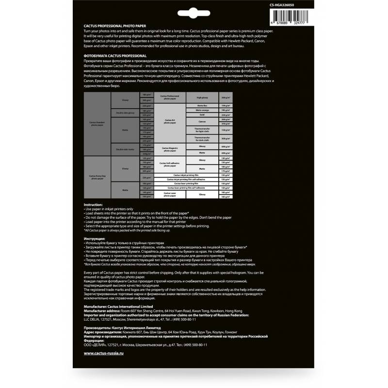 Фотобумага Cactus Prof CS-HGA326050 A3/260г/м2/50л./белый глянцевое для струйной печати