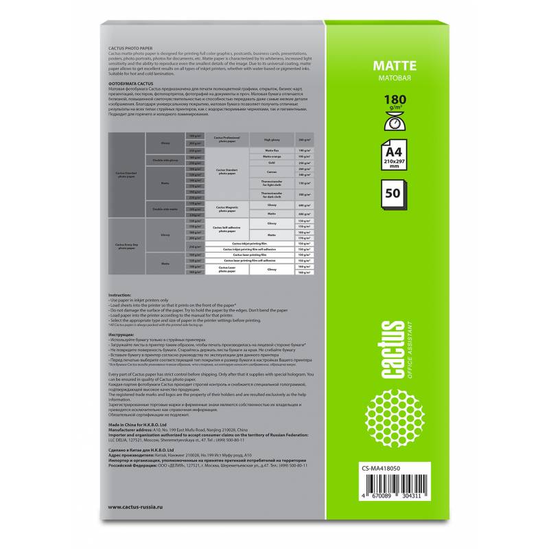Фотобумага Cactus CS-MA418050 A4/180г/м2/50л./белый матовое для струйной печати