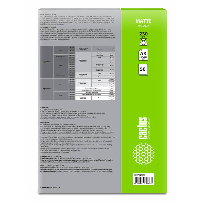 Фотобумага Cactus CS-MA323050 A3/230г/м2/50л./белый матовое для струйной печати
