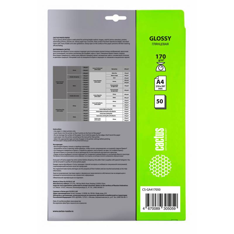 Фотобумага Cactus CS-GA417050 A4/170г/м2/50л./белый глянцевое для струйной печати