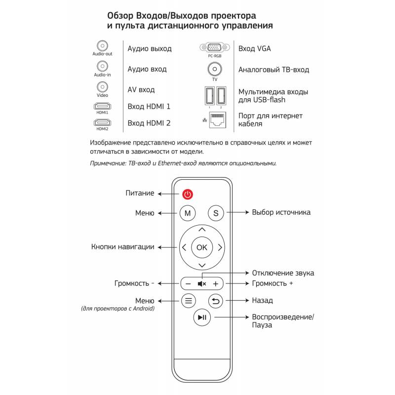 - кабель HDMI 1.5м, 3,5 мм кабель AV, кабель питания, пульт ДУ, салфетка из микрофибры, руководство пользователя
